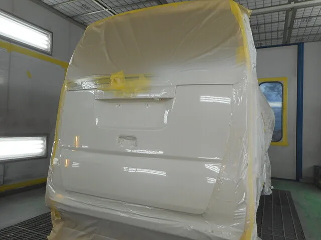 調色後 塗装部分以外をしっかりとマスキングし機密性の高いブースで塗装していきます。
